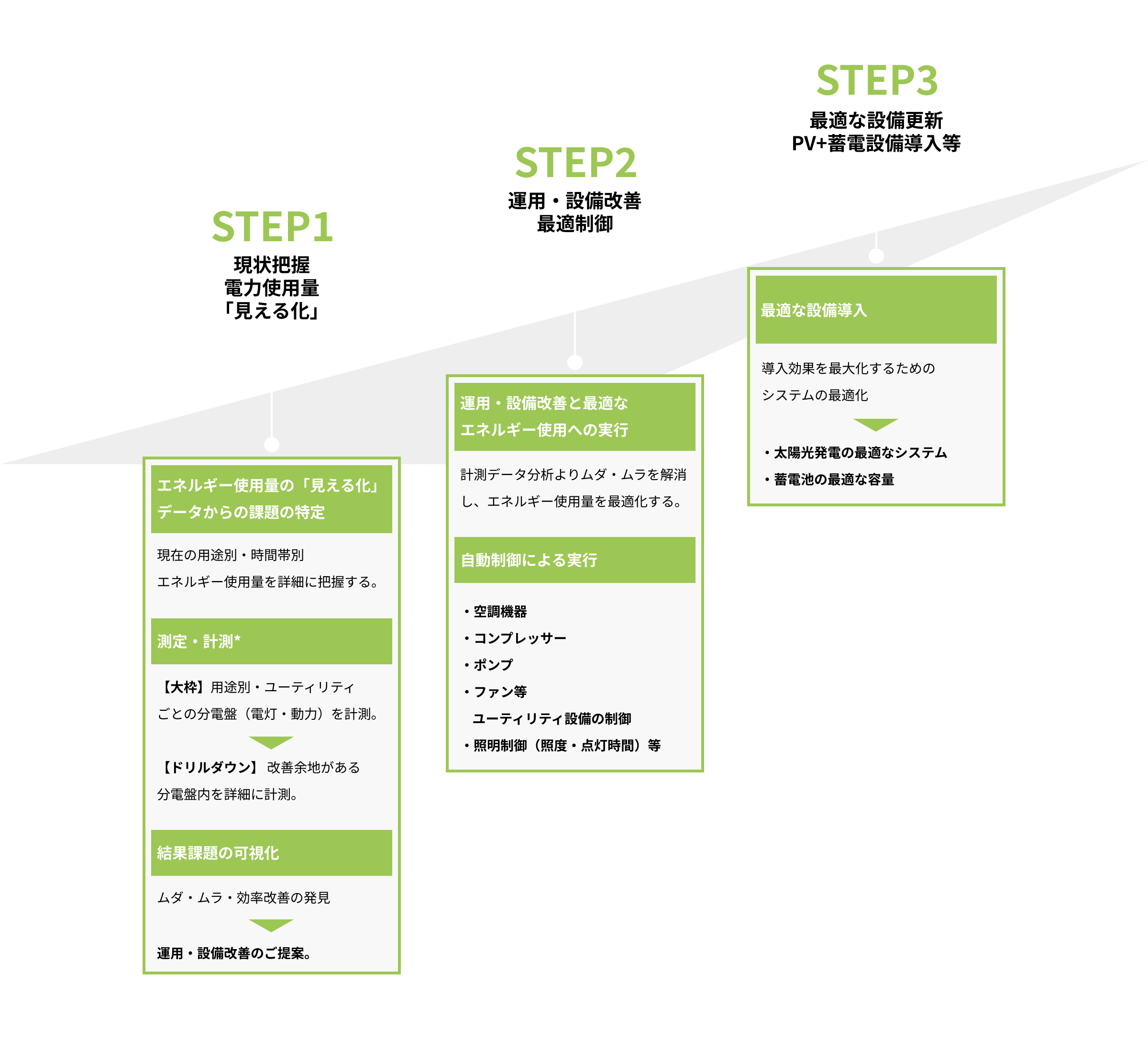 全体像 ▶ 現在の利用状況を把握し、運用・設備を改善を実行、最終的に最適な設備機器を導入する。
